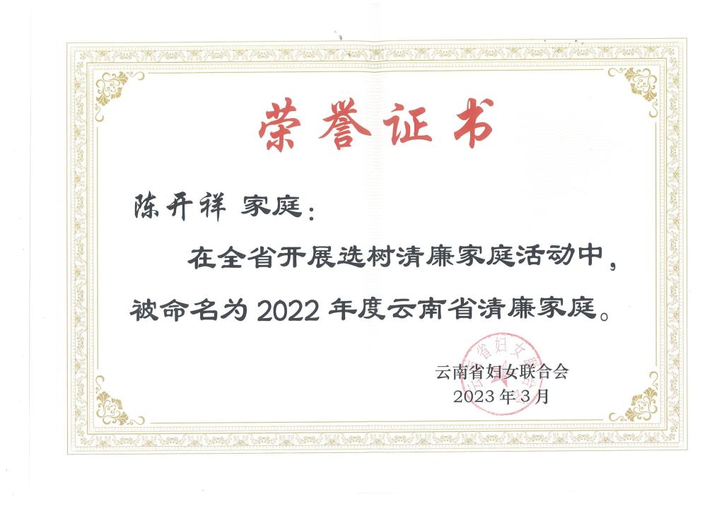 近日,云南省妇联开展的2022年云南省清廉家庭选树活动结果揭晓,新葡萄官网陈开祥家庭荣获云南省“清廉家庭”称号。