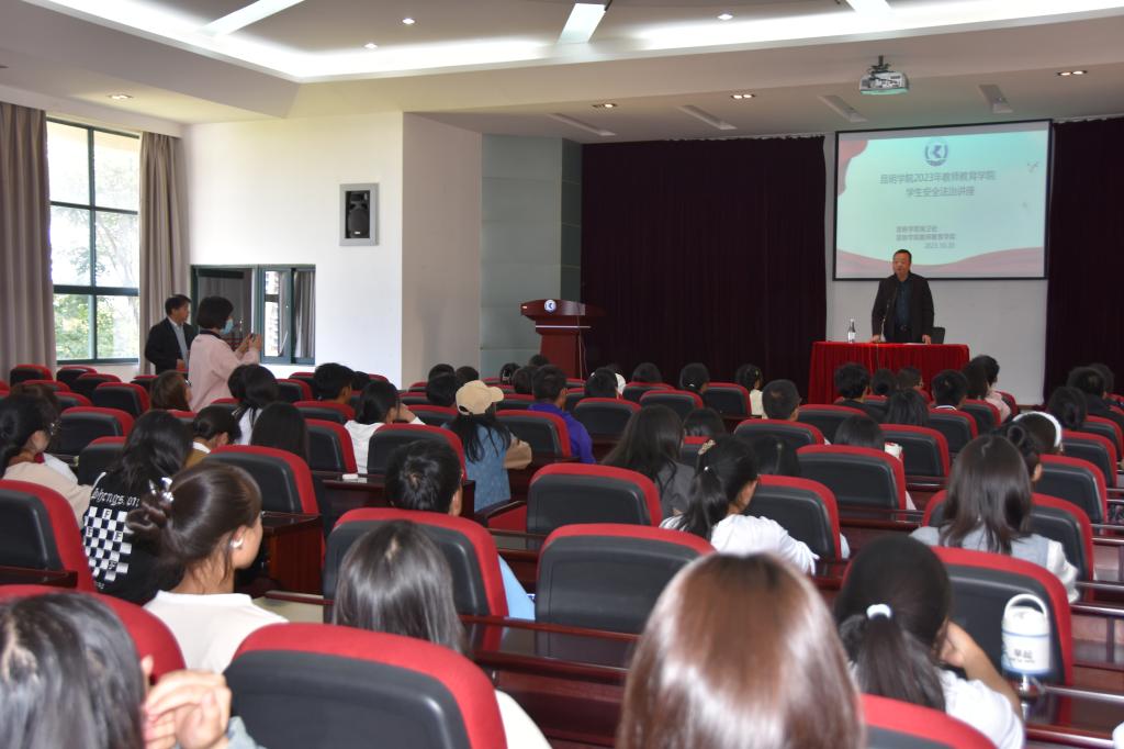 10月20日下午保卫处联合教师教育学院举办了新生安全法治讲座。保卫处副处长张智益就校园常见安全问题和要注意的安全事项作专题讲解,学院副书记鲁寿坤、学院辅导员、2023级新生参加了本次讲座。