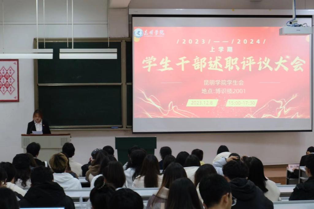 12月8日,新葡萄官网学生会2023-2024学年上学期学生干部述职评议会在博识楼2001召开。学生处副处长刘艳萍、校团委副书记荣杨,校学生会成员、各二级学院学生会代表及学生代表共146人出席本次会议。
