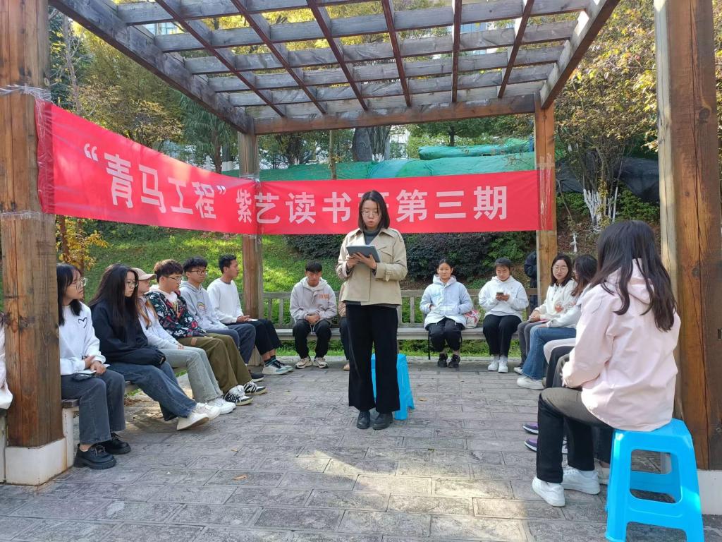 12月2日上午,新葡萄8883官网AMG第十四期“青马工程”卓越班学员紫艺读书会(第三期)在听心湖畔举办。读书会以“读红色经典 与博览同行”为主题,聚焦强国复兴相关学习篇目开展学习。校团委宣传部负责教师杨彦主持读书会并领学,“青马工程”卓越班学员参加。