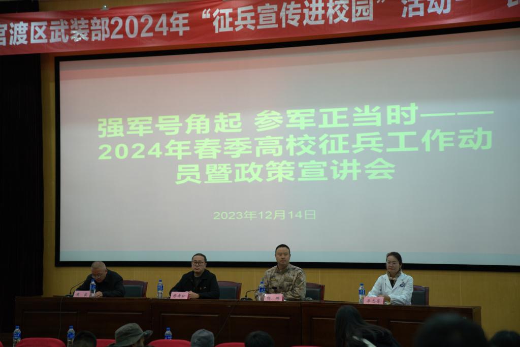 为进一步强化青年学子国防观念,激发大学生携笔从戎、参军报国热情,12月14日上午,昆明市官渡区人民武装部联合新葡萄官网举办主题为“强军号角起,参军正当时”的2024年春季高校征兵宣讲会,并开展现场政策咨询活动。学校武装部负责人,各二级学院负责征兵工作的辅导员及2024届毕业班280余名同学参加。
