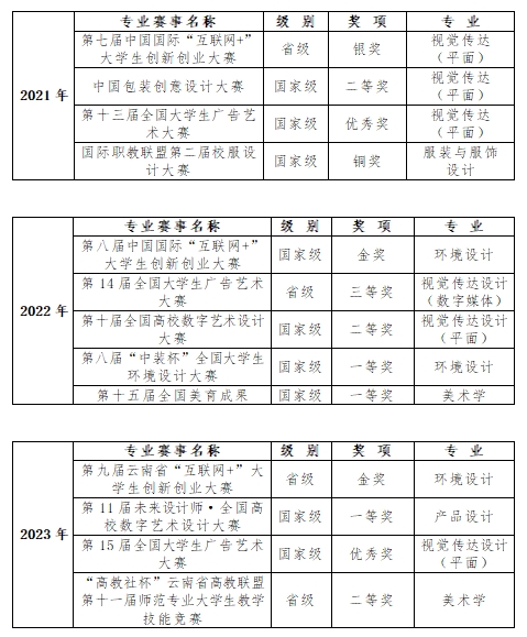 近三年,美术与艺术设计各专业学生参加国际国内专业赛事展览获奖成果丰硕。其中,参加国家级、省级赛事展览600余项,学生学科竞赛获奖 565项。代表性奖项如下: