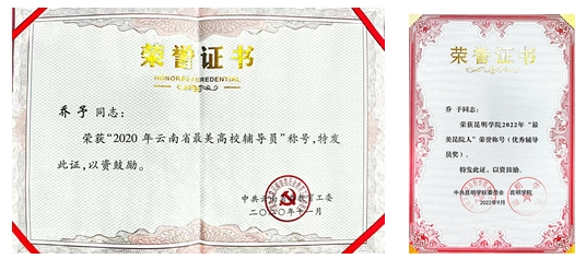 学院辅导员乔予荣获“2020年云南省最美高校辅导员”称号,并获得2022年新葡萄8883官网AMG“最美昆院人辅导员奖”。