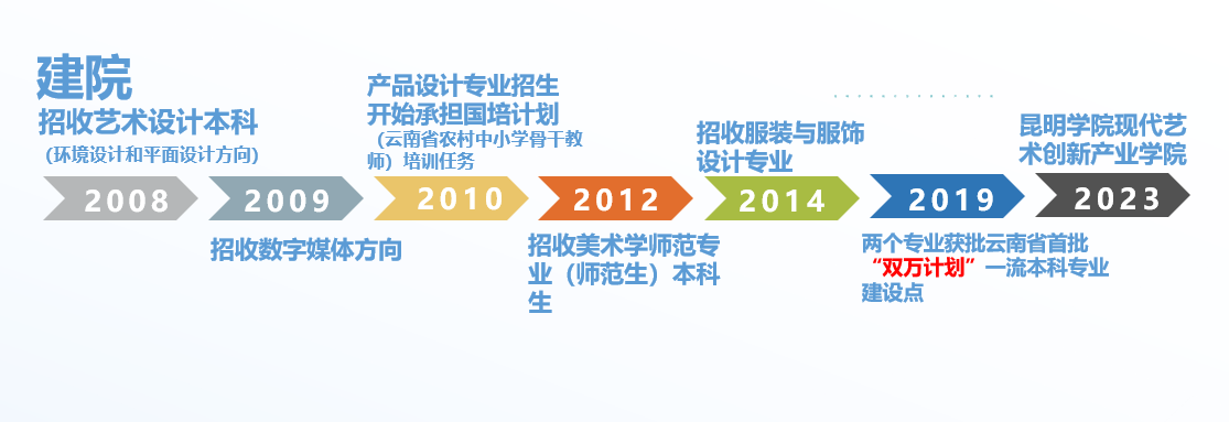 新葡萄8883官网AMG美术与艺术设计学院于2008年10月由原昆明师范高等专科学校美术学专业与昆明大学艺术设计专业整合建院。2008年本科艺术设计专业环境设计方向和平面设计方向招生,2009年本科艺术设计专业数字媒体方向招生,2010年本科产品设计专业招生,学院开始承担国培计划(云南省农村中小学骨干教师)培训任务,2012年本科美术学专业(师范类)招生。教育部本科专业目录变更后,艺术设计专业变更为视觉传达设计专业和环境设计专业。2014年本科服装与服饰设计专业招生。经过十余年建设发展,视觉传达设计专业、环境设计专业在2019年获批云南省首批“双万计划”一流本科专业建设点。目前,视觉传达设计专业下设三个方向:平面设计、数字媒体设计、平面与新媒体艺术设计;服装与服饰设计专业下设服装设计、服饰设计两个方向。