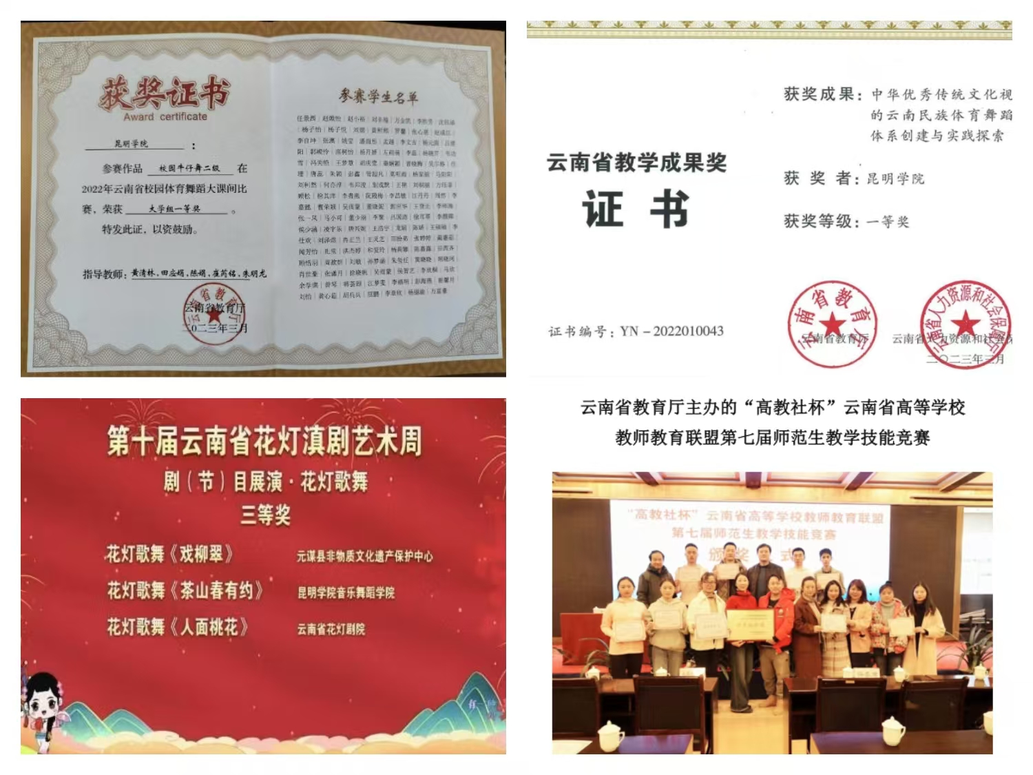 学院先后被授予云南省学生体育协会体育舞蹈专业委员会负责单位、云南省体育舞蹈专业高考统考点、中国大学生体育协会体育舞蹈分会主席单位、云南省民族团结教育基地、全国民族团结进步模范集体等荣誉称号。2018年中央财政支持地方高校项目“云南跨境少数民族歌舞乐数字化保护与传承基地”获批立项;2021年与文旅部文化艺术发展中心共建“云南美育素质教育研究院”。