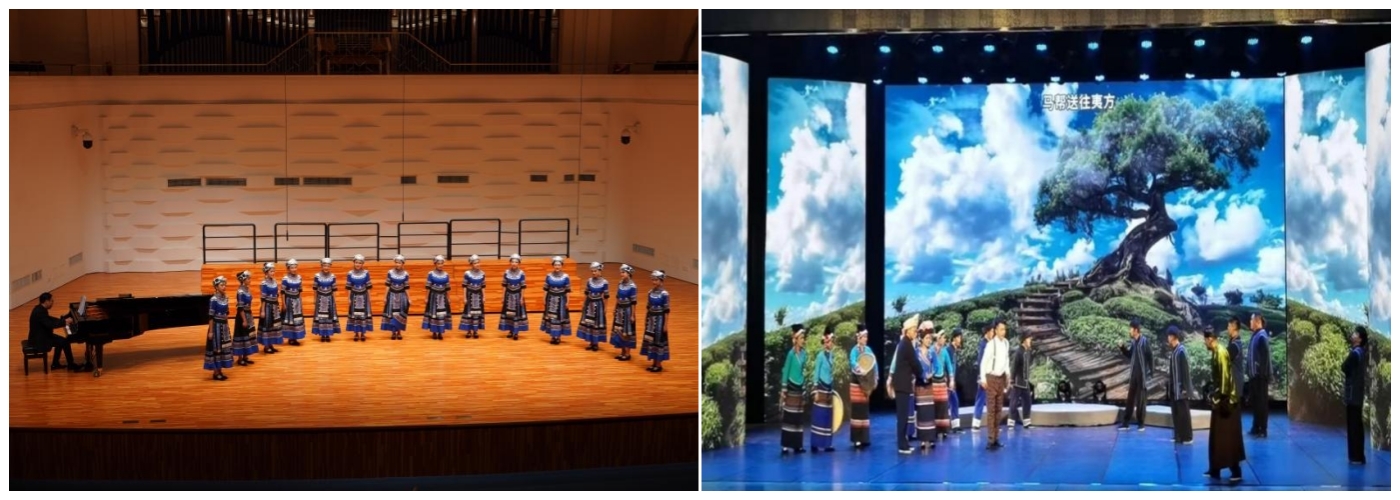 学院充分利用“云南省民族团结教育基地”,深入基层,编创文艺精品、民族乐舞,助力民族艺术的传承与推广,铸牢中华民族共同体意识;依托学校“中国—上合青年交流中心”国家级平台、借助学院“云南跨境少数民族歌舞乐数字化保护与传承基地”的优势,积极开展国际艺术文化交流,传播中华优秀传统文化。