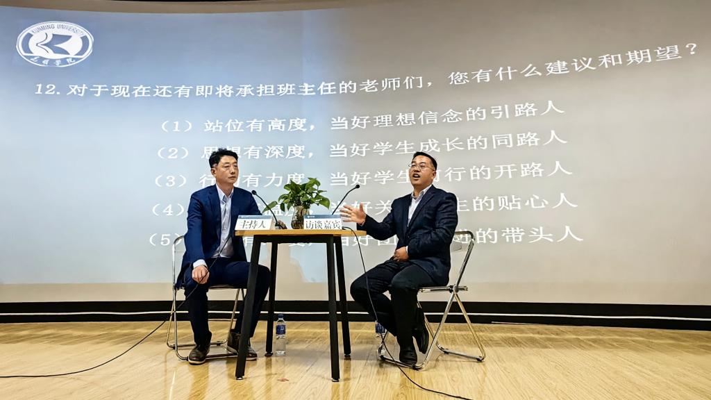 访谈过程中,刘兴全就学生工作认知、工作思路和具体方法、学生工作重难点、日常思政教育方法、心理健康教育、学风建设、服务学生等多个方面与主持人进行了交流分享,对新葡萄官网辅导员和班主任们提出了工作意见和建议。参训老师就辅导员、班主任工作定位、具体工作案例等内容与刘兴全老师进行了热烈讨论。