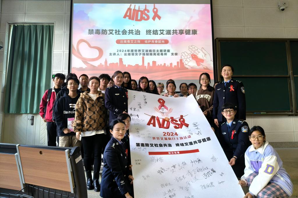 最后,全体师生联名签署了2024年世界艾滋病日活动主题海报,共同表达了“禁毒防艾社会共治,终结艾滋共享健康”的决心。此次活动的成功举办,不仅增强了学生们的禁毒防艾意识,也为构建健康、安全的校园环境奠定了坚实基础。