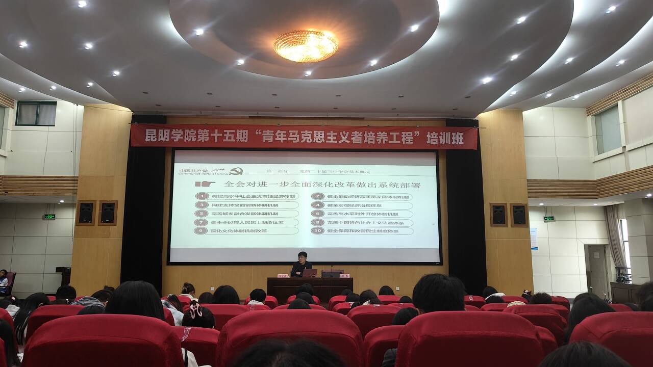 11月8日下午,学校第十五期“青年马克思主义者培养工程”培训班理论学习第二课暨“青年讲师团”专题培训在惟行楼1501报告厅举行。云南省大中小思政课一体化建设指导委员会委员、云南省思政课骨干教师、马克思主义学院教授缪文武作“当改革先锋 担青春使命—深入学习贯彻党的二十届三中全会精神”专题讲座。缪文武以党的二十届三中全会召开的重大历史意义和现实意义为切入点,从“全会基本情况”“当改革先锋 担青春使命”两个部分展开论述,深入剖析了党的二十届三中全会的丰富内涵和精神实质。他指出,要深入学习领会全会精神,深刻领会和把握进一步全面深化改革的主题、重大原则、重大举措、根本保证。他勉励参加培训的学员,要以党的二十届三中全会精神为指引,凝聚青春力量、奋进新的征程、勇当改革先锋、敢担青春使命,在全面建设社会主义现代化国家的火热实践中绽放绚丽之花。