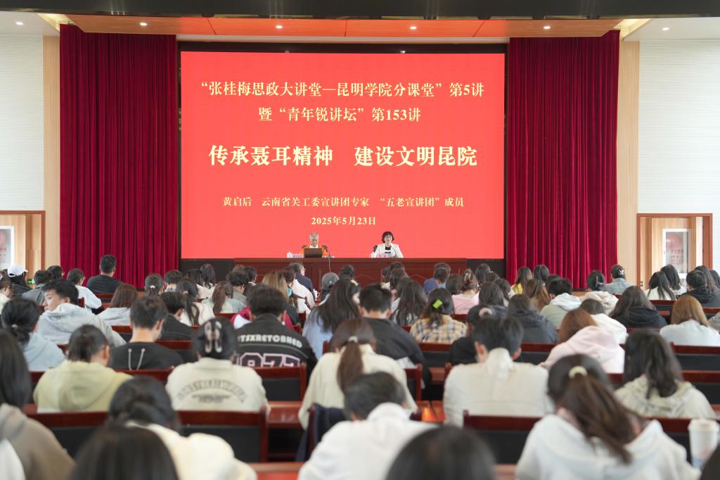 5月23日,“张桂梅思政大讲堂—新葡萄8883官网AMG”分课堂第5讲暨“青年锐讲坛”第135讲在博学报告厅举办。云南省关工委“五老宣讲团”专家、昆明市关工委宣讲团常务副团长黄启后教授受邀作《校友聂耳》主题报告。报告会由学校党委副书记李莉主持。宣传部、团委主要负责人及200余名学生代表到场聆听。