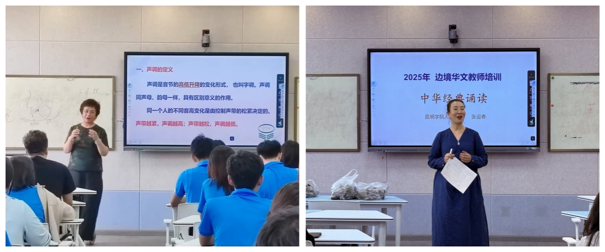 开班第一课,全国推普先进个人陆惠云教授从基本概念入手,以普通话“声、韵、调”的基础知识与训练为核心,夯实华文教师汉语能力的“语言基因”。《中华经典诵读》课上,第四届“诗教中国”诗词讲解大赛国家一等奖获得者张迎春副教授从声韵美学的角度,从规范度、流畅度和自然度三个层面阐释"以声传情,以韵表意”,塑造中华文化审美表达的“声音名片”。