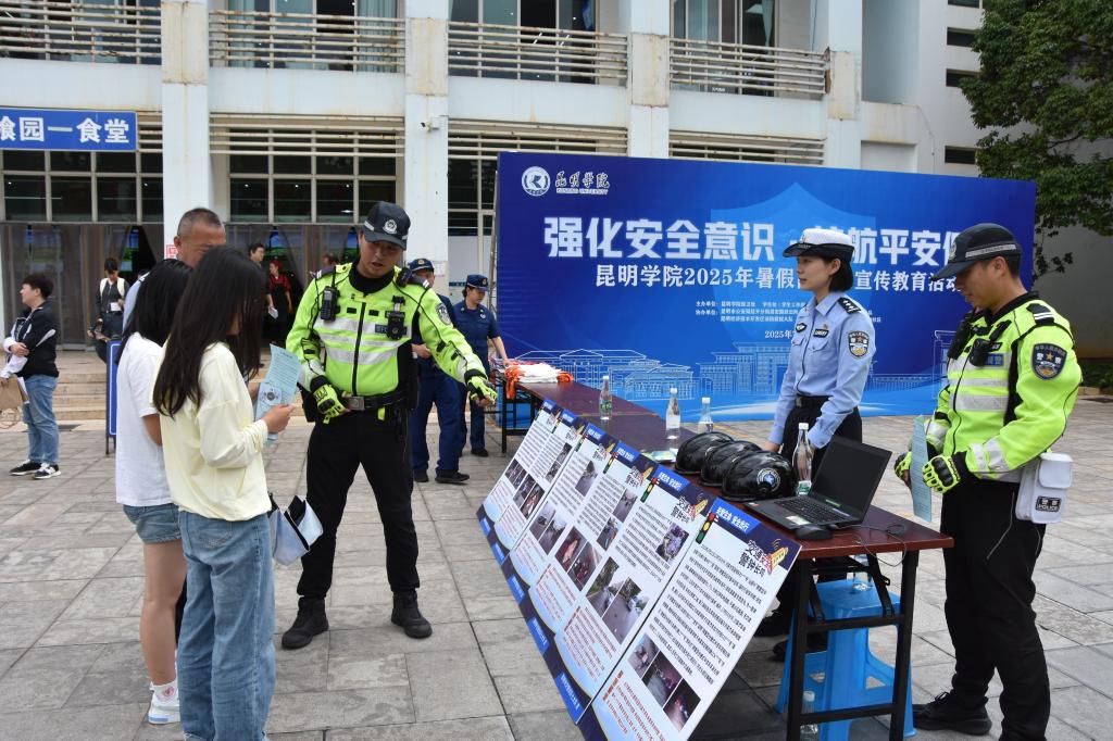 7月8日上午,保卫处、学生处、后勤管理中心联合昆明市公安局交通管理支队七大队、经开区消防救援大队、经开公安分局昌宏路派出所、阿拉街道办事处及云知社区,举办新葡萄8883官网AMG“强化安全意识·护航平安假期”2025年暑假前安全宣传教育活动。