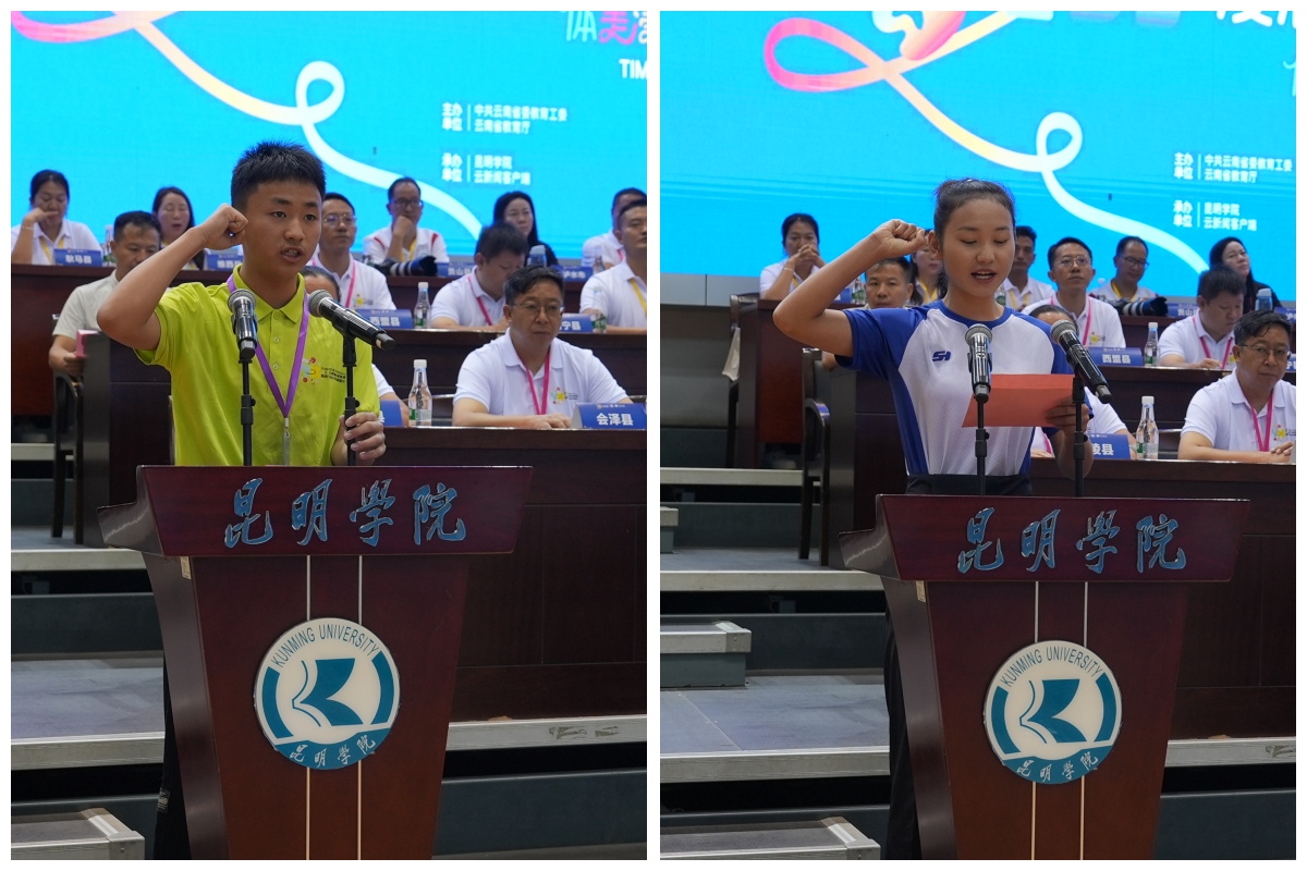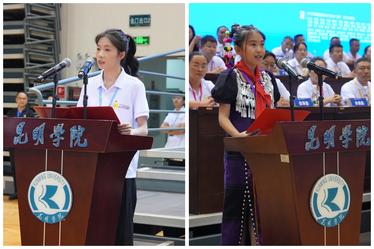 开幕式上,新葡萄8883官网AMG美术与艺术设计学院2022级美术学专业学生赵海燕作为高校驻点大学生代表发言,分享参加美育浸润计划的收获和感悟。来自德宏州陇川县第二小学五年级的小学生代表黄紫淇同学动情分享了支教教师们给他们进行专业指导和情感交流的故事。运动员代表,红河州河口县云南师范大学附属河口国门小学余皓明同学、裁判员代表王寒蓉分别进行了宣誓。