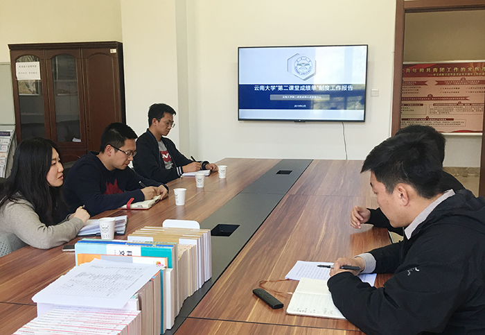 云南大学团委书记于春滨向新葡萄官网调研人员介绍了云南大学开展第二课堂工作的基本情况和思路。他表示,学校领导重视,学校政策支持是第二课堂体系化常态化运行的重要保障, “第二课堂成绩单”已成为毕业生资格认定的标准之一。同时于书记从“到梦空间软件系统运用”、“打造第二课堂精品课程体系”、“加强第二课堂竞赛体系建设”、“第二课堂展示体验中心建设”等方面介绍了云大开展第二课堂的工作特色和经验。云大校团委王鹏飞对“第二课堂成绩单”制度建设、成绩管理认证、学分积分兑换标准、工作队伍的管理及培训等工作做了详细说明。双方人员也就“第二课堂”实施中的有关问题进行了交流。