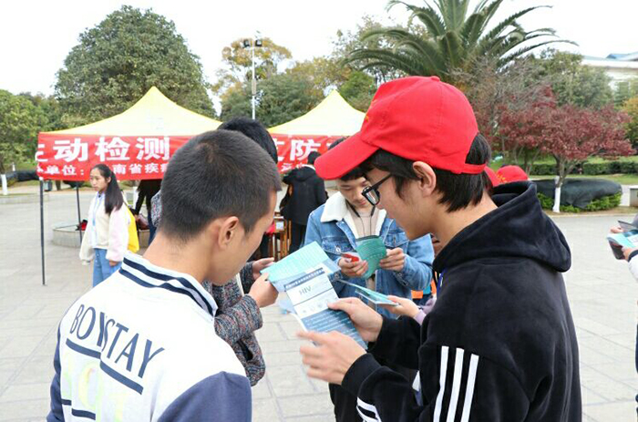 活动于当天下午2:00准时开始,随后志愿者们分为三组,第一组同学在聂耳广场附近发放有关艾滋病的宣传单;第二组同学为大家讲解展板内容,其中包括艾滋病的来源、传播途径以及防预措施、检测包及避孕套的正确使用方法等;第三组同学在帐篷下发放HIV检测包并鼓励大家主动检测。活动过程中,志愿者们组织前来询问的同学在写有“主动检测,知艾防艾,共享健康”标语的横幅上签字,呼吁大家行动起来,携手共同遏制艾滋。