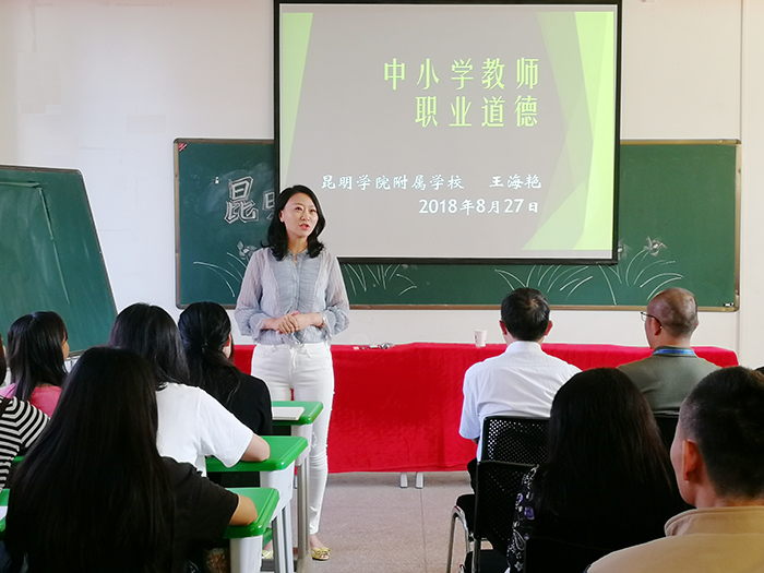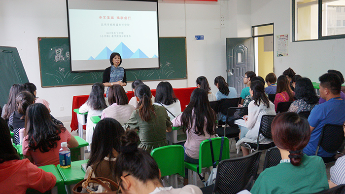为加强新葡萄官网教师队伍建设,提高教师师德和业务水平。8月25日-28日新葡萄官网开展了为期4天的校本培训。此次培训有计划、有组织、有步骤,内容丰富,成绩喜人。 李晋德校长从学校工资制度改革、奖惩办法、考勤制度及学校六年发展规划向大家做交流。他将学校未来六年发展分“两个三年”走,紧紧围绕“服务、特色、质量”的发展理念,不断形成“领导服务 教师爱校 学生乐学”和“学生开心 家长舒心 社会放心”的良好氛围,从而不断实现“经开领先 昆明一流 全国示范”的总目标。李广峰副校长则从学校常规教学管理制度及教学过程中管理实施细则向大家作介绍。“没有规矩,不成方圆。”建立健全教学常规管理制度是抓好教学工作、有序开展教学活动的前提和保证。 王海艳书记为全体教师进行“中小学教师职业道德”培训,进一步规范了新葡萄官网教师的从教行为,全面提升教师职业道德素养和业务素质。使得新葡萄官网教师在职业道德规范的要求中不断内化为自身的自觉行为,并坚持做到正人先正己,身教重于言教、树立良好的师表形象,努力使自己的行为符合新时期教师的职业道德规范。 昆明盘龙区教育教学科研中心、昆明盘龙区教师进修学校陶树坤老师对全校教师职业规划和工作智慧等方面进行了专业指导。陶老师用一个个鲜活的师生案例向大家传授着教师如何在教育教学中展现智慧与力量,如何用潜移默化的方式带领学生进行思考与学习,帮助学生更快地成长起来。