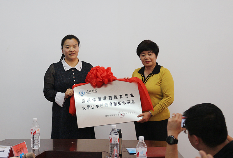 唐敏院长将“大学生乡村教育服务示范点”牌匾授予香格里拉市体育教育局牛盈春局长,沈中灿书记将“大学生创新创业乡村幼儿教师培训示范点”牌匾授予三坝乡副乡长树继文。