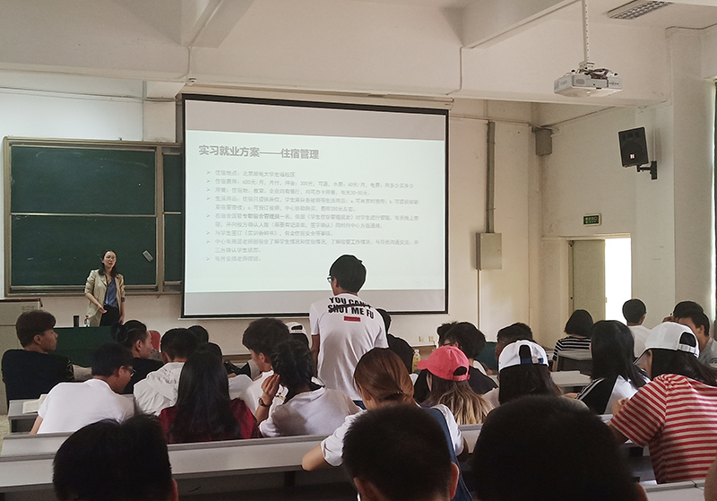 5月24日,信息工程学院于在博识楼1002举行了软件工程专业2016级实训宣讲会议。刘渝妍院长,辅导员张祥、侯焱及中关村软件园的老师出席宣讲会。中关村软件园的卢文静老师担任本次宣讲会主讲人。