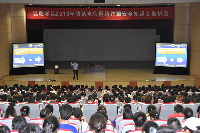 9月1日下午,学生处、保卫处联合举办“新葡萄8883官网AMG2019年电信网络诈骗安全知识专题讲座”。讲座邀请昆明市公安局国家经济技术开发区分局法制办警官闫文赋主讲,旅游学院、经济学院、城建学院2019级1300余名新生参加讲座,讲座由保卫处喻玲老师主持。