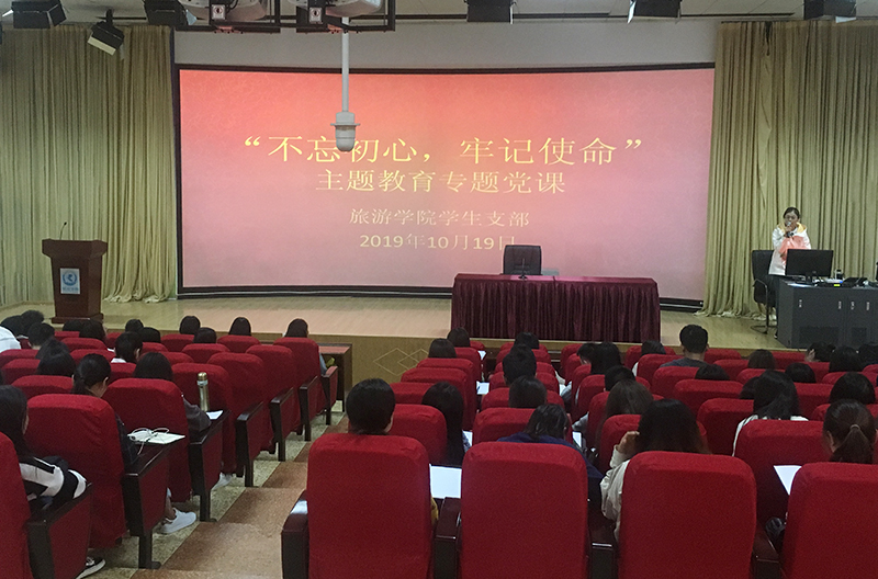 10月19日上午,全体同志在旅游学院3D报告厅听三位支部书记讲党课,本次党课围绕主题“不忘初心、牢记使命”展开。金刚老师讲到“八个明确”和“十四个坚持”。杨雁老师主要围绕中华人民共和国成立70周年相关活动内容进行讲解,通过一张张图片回顾了中国150个第一,70年创新突破。从“洋货”到“中国制造”,从“中国制造”到“中国创造”,大家看到了国家的快速发展和繁荣昌盛。环绍军老师与同志们作关于“初心”问题的深度探讨,指出做人的四种境界,希望同志们能做到利人利己,在帮助别人的同时也能成就自己,为建设有中国特色的社会主义事业作出自己的贡献。当天下午,全体同志继续在旅游学院3D报告厅进行学习。学习内容为观看党的十九大开幕式的视频。