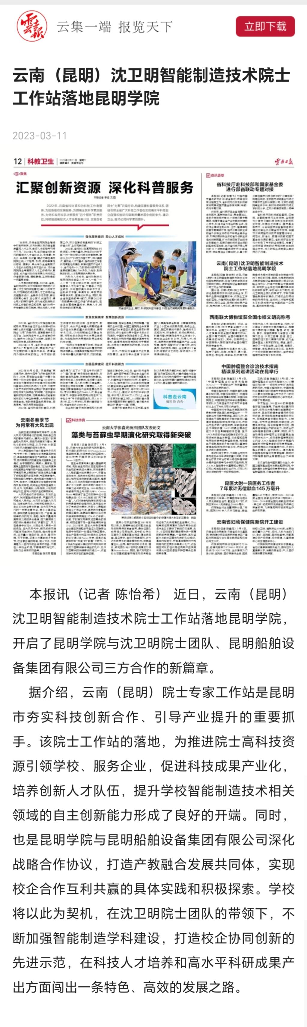 云南(昆明)沈卫明智能制造技术院士工作站落地新葡萄8883官网AMG