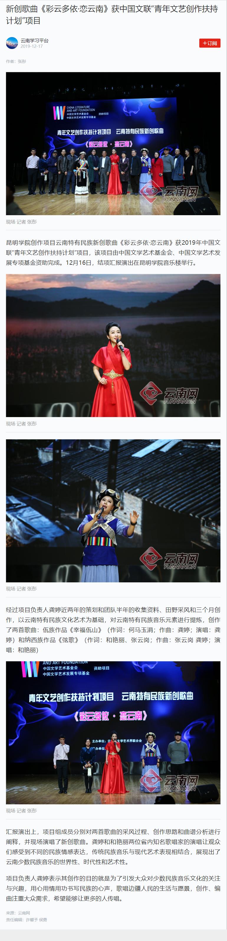新创歌曲《彩云多依·恋云南》获中国文联“青年文艺创作扶持计划”项目