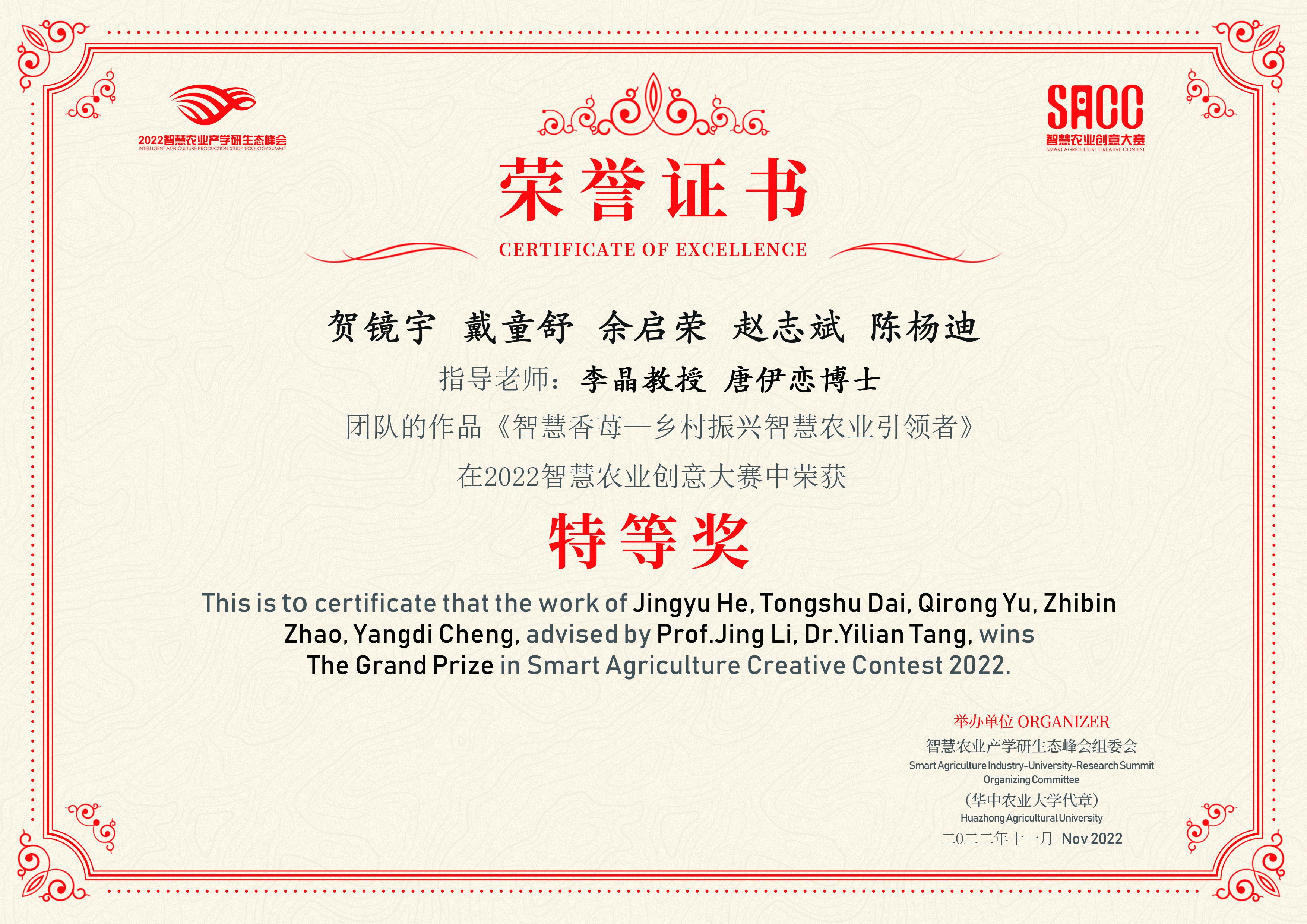 智慧香莓团队由农生学院李晶教授、机电工程学院唐伊恋博士指导;农生学院、机电工程学院、美艺学院的1位研究生与4位本科生组成。团队在前期工作基础上,系统开展了高原草莓光温电耦合与分子遗传相关研究,研发了草莓智慧种植系统、精准溯源系统、草莓植物工厂等多项创新技术与产品。本次获奖对新葡萄官网智慧农业本科专业申报,人才培养、学科建设与科学研究具有积极意义。