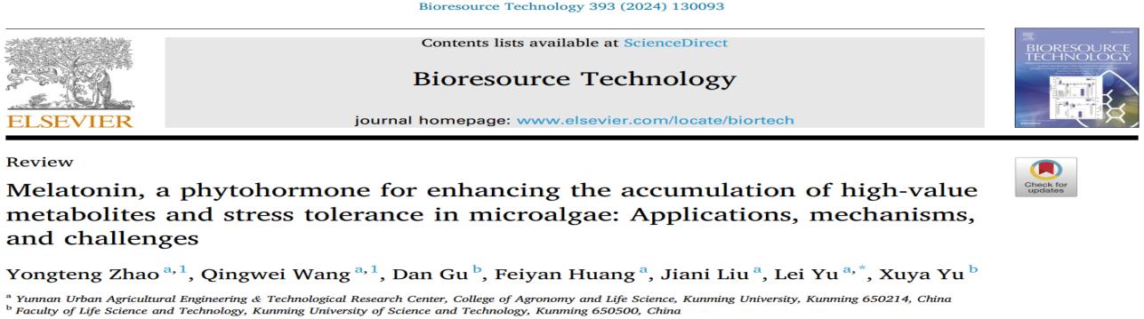 近日,新葡萄官网农生学院/云南省都市特色农业工程技术研究中心余磊教授团队完成的论文“Melatonin, a phytohormone for enhancing the accumulation of high-value metabolites and stress tolerance in microalgae: Applications, mechanisms, and challenges”在生物资源和技术领域TOP期刊《Bioresource Technology》(简称BT,SCI中国科学院一区/JCR Q1,影响因子:11.4)上发表。该文以新葡萄8883官网AMG为第一完成单位,新葡萄官网青年教师赵永腾博士为第一作者,余磊教授为通讯作者,2023级硕士研究生王清卫同学、刘佳妮教授和黄飞燕副研究员为论文的共同作者。