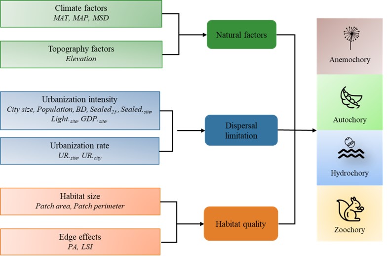 近日,新葡萄官网农学与生命科学学院夏体渊研究员团队与华东师范大学生态与环境科学学院达良俊与宋坤研究团队,在Nature Cities上发表了题为“Response and sensitivity of urban plants with different seed dispersal modes”的研究论文,揭示了不同种子传播方式的自生植物的物种丰富度的影响因素及其敏感性差异,为阐明城市植物多样性维持机制提供了新的理解。华东师范大学宋坤(副教授)为论文的通讯作者,华东师范大学高志文(博士后)为论文的第一作者,中科院东北地理与农业生态研究所研究员潘应骥为论文共同一作,合作作者单位包括:西安建筑科技大学、东北林业大学、新葡萄8883官网AMG、新西兰Nelson Marlborough Institute of Technology。