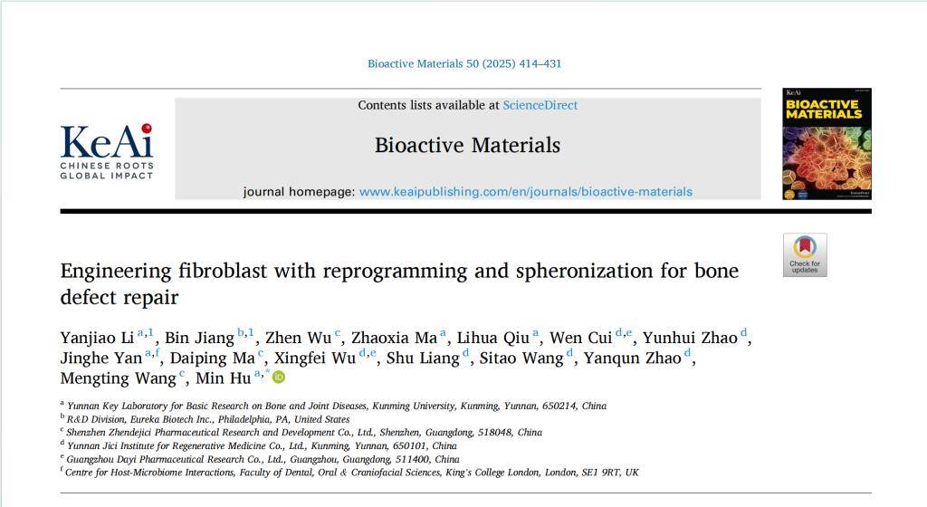 云南省骨与关节疾病基础研究重点实验室研究团队多年来致力于新型干细胞类型研发及难治性老年病的自体功能细胞治疗研究。此次发表的研究成果,成功开发出一种创新性方法,即通过化学重编程和球状化技术将皮肤成纤维细胞转化为诱导成骨细胞,并利用这些细胞形成可移植的组织球体,为严重骨折或骨不连的临床治疗提供了全新且可行的解决方案。