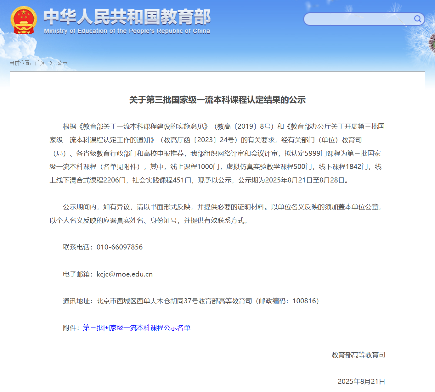 8月22日,教育部网站发布《关于第三批国家级一流本科课程认定结果的公示》,新葡萄官网4门课程成功入选,分别为:学特学院高春玲教授《幼儿园管理》、旅游学院田芙蓉教授《餐饮运营管理》、农生学院侯秀丽教授《生态学》、人文学院孙雪莹副教授《纪录片与专题片研究》。这是学校首次获批国家级一流课程,是在课程建设中取得的重大突破。