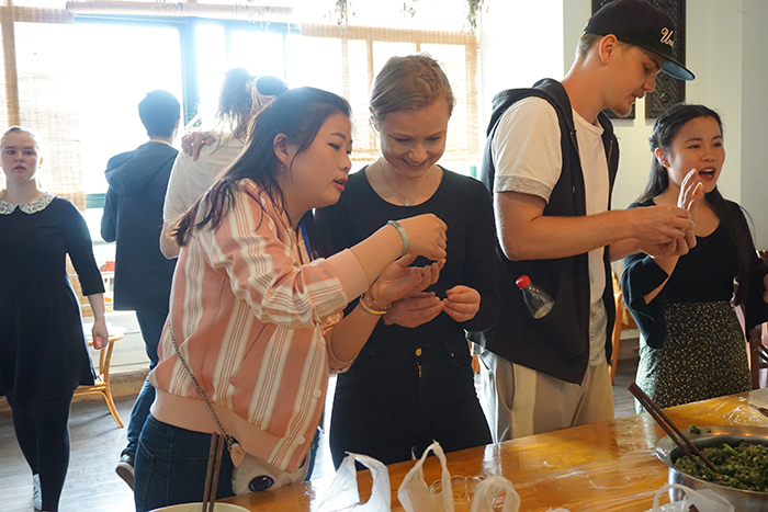 欢迎见面会后,挪威NLA大学师生一行人到新葡萄官网体育馆、青年活动中心、美艺学院开展了一系列的交流文化活动。外国语学院学生为挪威师生展示了怎样包饺子,并邀请挪威师生体验包饺子的过程。美艺学院的蒋老师向来访客人展示了自己的剪纸作品。双方的同学还就各自的大学生活和英语学习展开了细致地讨论。