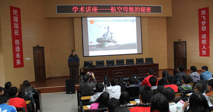 讲座从我国第一艘航空母舰“辽宁号”说起,介绍了其建造、试验及服役的整个过程。接着以航空母舰四宗“最”,即最具争议的武器、保镖最多的武器、最昂贵的武器、最难驾驭的武器四个方面为切入点向同学们解析了航空母舰从诞生到现在的发展历程。同时讲座还配以大量丰富而鲜见的图片、视频资料和详尽的数据,生动形象地向同学们展示了航空母舰的外形内构、航母的生活设施以及飞机如何在航母上起飞和降落,进一步加深同学们对航母的认识。
